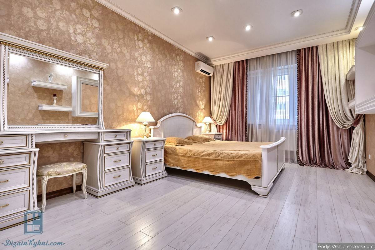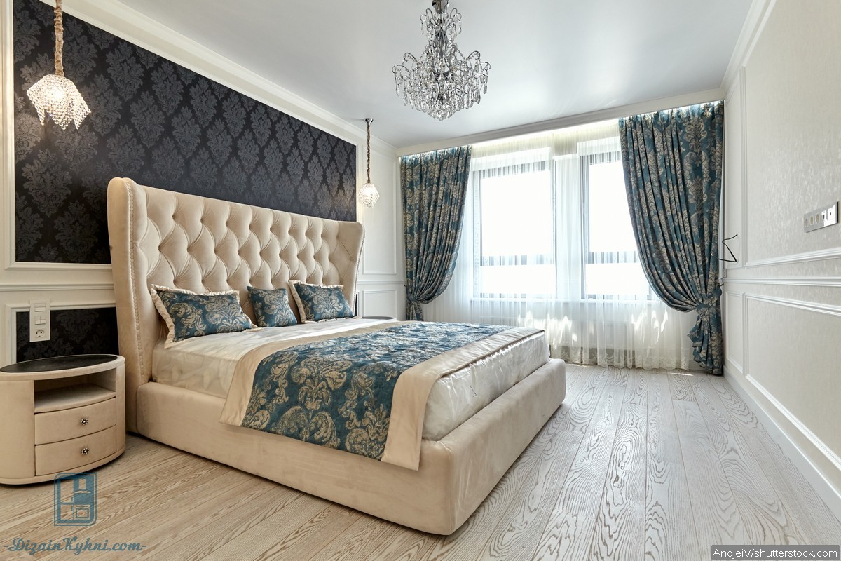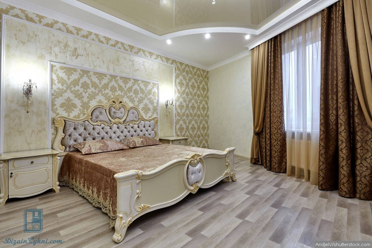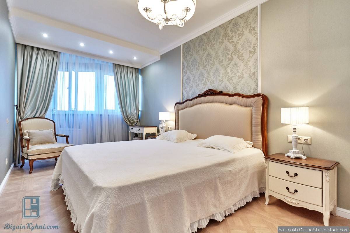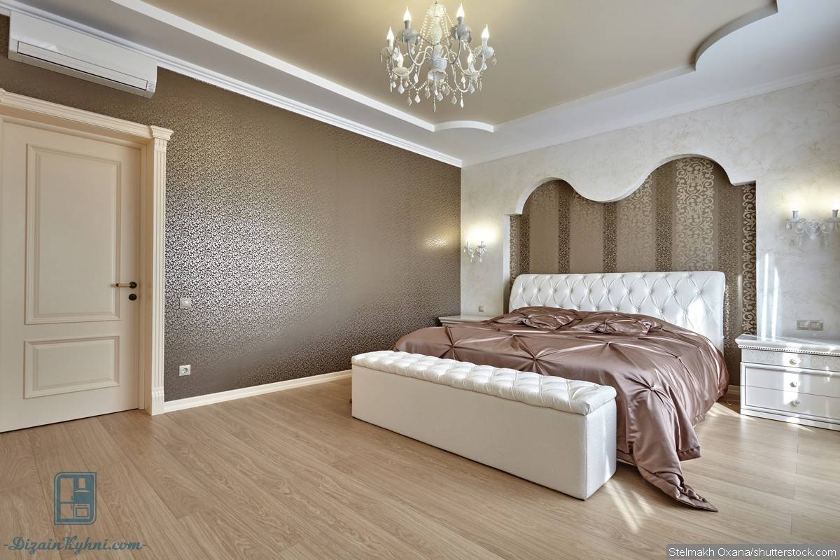 Для спальни, оформленной в классическом стиле, идеально подойдут бумажные или тканевые обои. Лучшие варианты настенного покрытия – однотонное, с растительными или витиеватыми узорами, а также вензелями. Нередко на обоях классического стиля присутствует покрытие из платины или позолоты. Это придаст интерьеру особого шика и богатства.