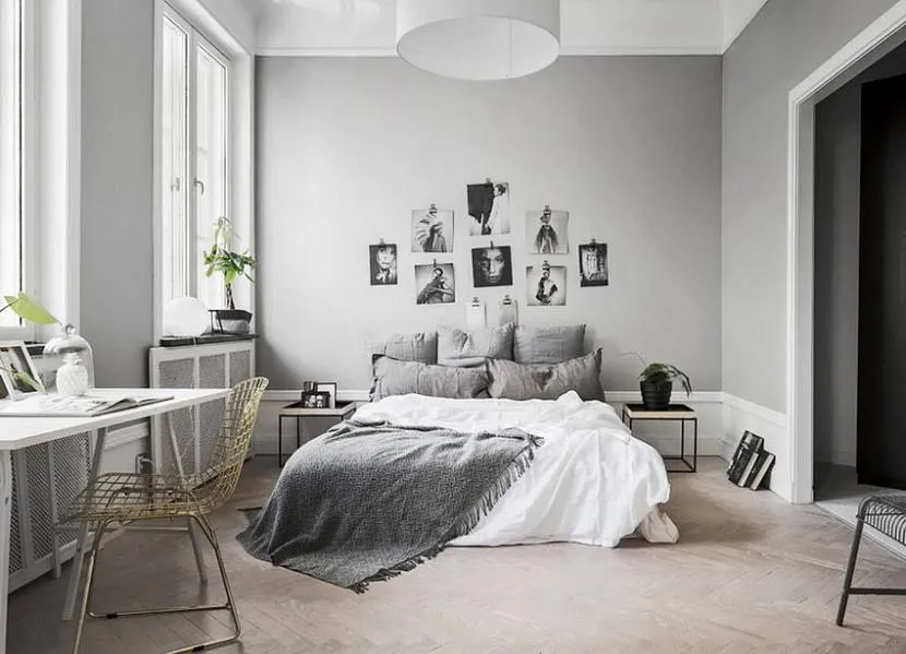На фото минималистичный интерьер спальни, выдержанный в белой и серой цветовой гамме.