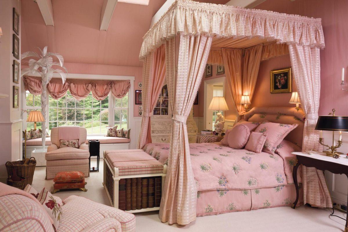 Красивая мебель, милые безделушки, масса мягких подушек являются неотъемлемой частью нежно-розового интерьера. Наиболее гармоничным является сочетание с белым цветом (лёгкие занавеси, мебель, мягкое изголовье кровати, ажурный балдахин).