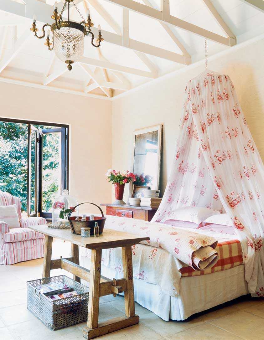 В данном стиле подразумевают нежные новые рисунки. Такая гамма будет эффектно смотреться на белоснежном фоне спального помещения. Нежности и утонченности добавят красивые кружева. Как вариант — установка состаренного шкафа с эффектами потертости. Декоративные элементы присутствуют повсюду: на каркасе кровати, тумбочках, шкафу.