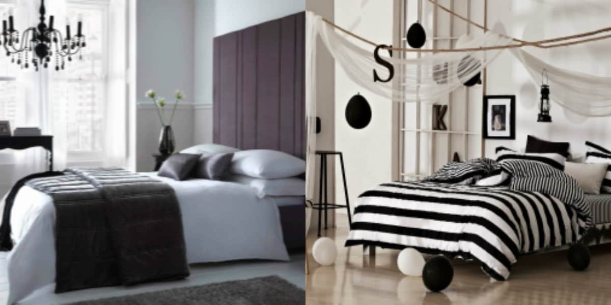 Вы можете отделать весь пол или лишь его часть черной глянцевой плиткой или разместить на кровати несколько полосатых декоративных подушек в черно-белом цвете.