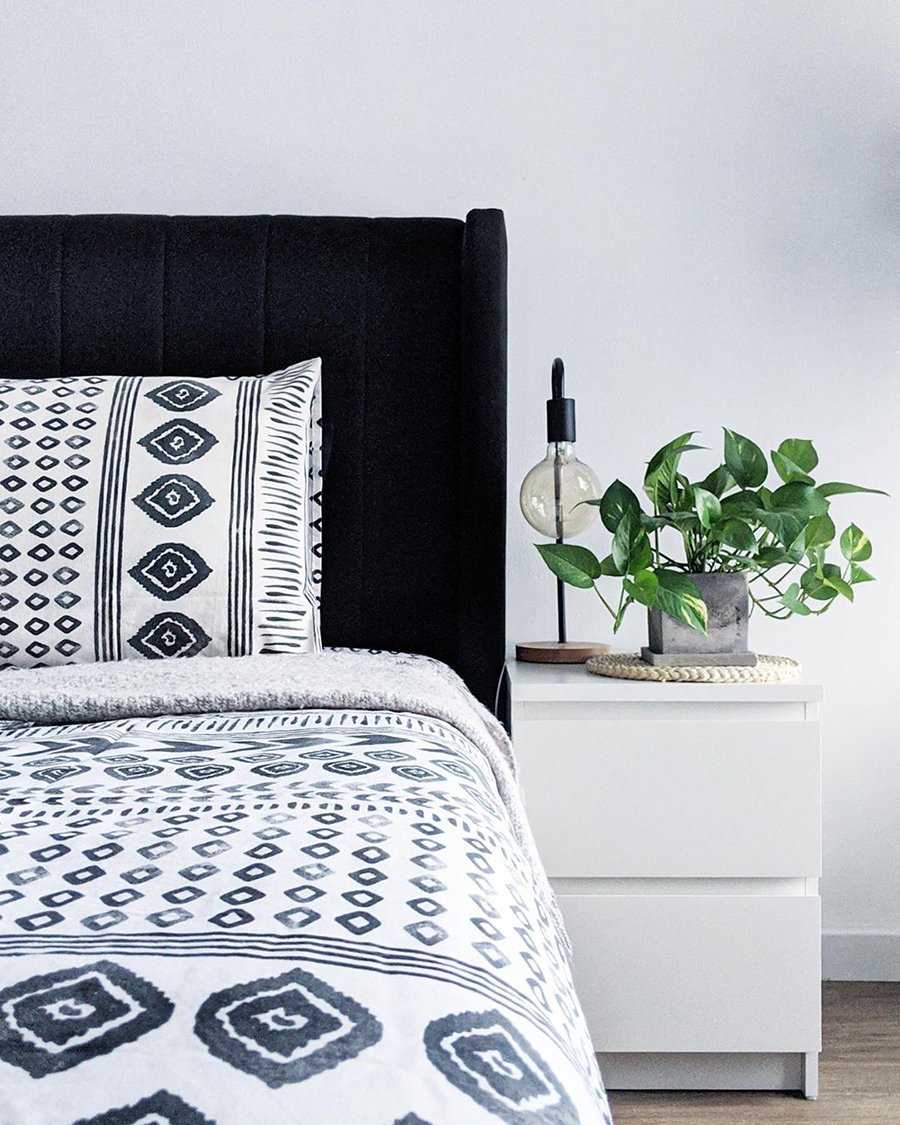 На фото спальня с идеально белыми стенами без декора, где в качестве акцента использован черный цвет в текстиле и картинной раме.
