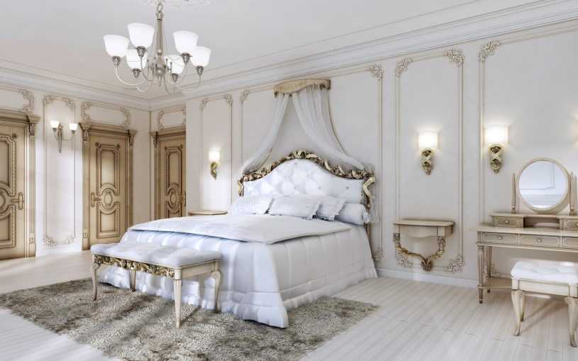 Классический стиль является универсальным выбором. Правильное сочетание винтажных элементов и изысканных предметов создадут ощущение безупречности и спокойствия. Но в оформлении классической спальни чистый белоснежный цвет можно встретить не часто.