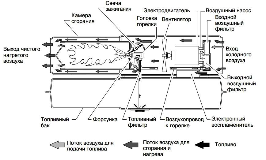 - Вентилятор загоняет холодный воздух в камеру, где тот нагревается от горящего топлива и выводится наружу теплым потоком.