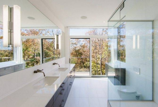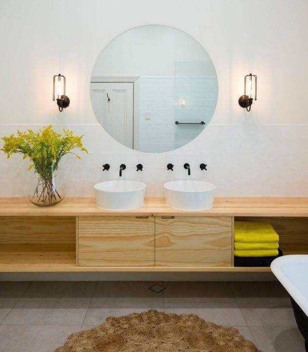 Преимущества его очевидны. Ванна с двумя раковинами позволяет экономить время, так как два человека одновременно могут заниматься чисткой зубов, умыванием, бритьем, нанесением макияжа и т.д. Это очень актуально для большой семьи.