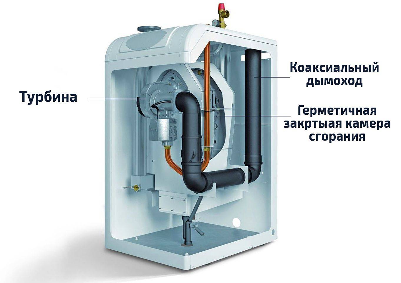 - с камерой сгорания закрытого типа (турбированные котлы) – не втягивают нагретый воздух из помещения, а берут его с улицы через коаксиальный дымоход, что сокращает теплопотери.
