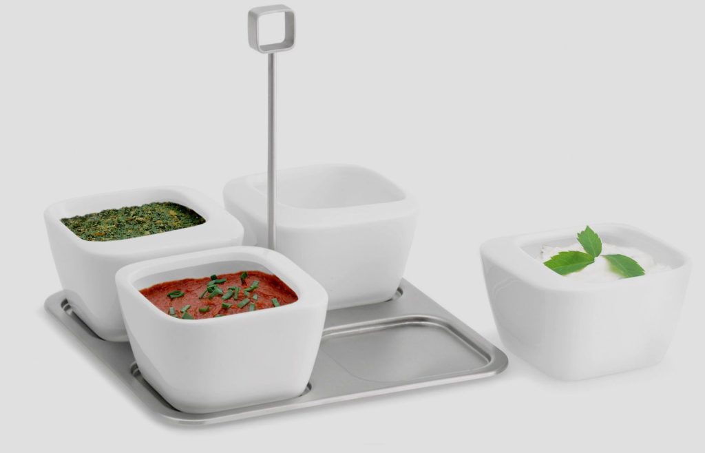 - Наличие дополнительных функций. Лучше подобрать посуду с крышкой. Это поможет надолго сохранить уникальный аромат специй. Не лишней будет и ложечка, которой удобно набирать густое содержимое. Подставка поможет сохранить скатерть чистой на протяжении всего праздника.