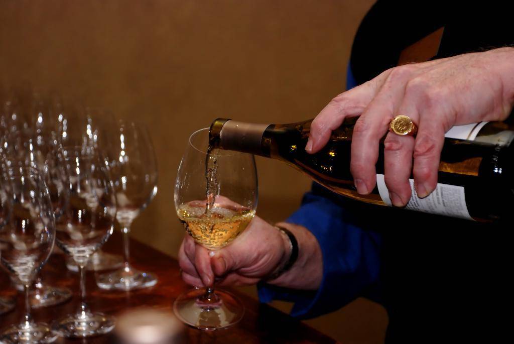 Горлышко необходимо держать в направлении стола. Сначала немного вина наливается в свой бокал, а потом остальным присутствующим гостям. Наливают бокалы на 2/3 объема.