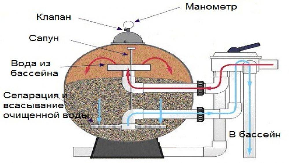 Фильтрация воды должна быть ежедневной, независимо от времени эксплуатации бассейна . Время фильтрации рассчитывают с учетом 2 — 3-х кратного пропуска воды через фильтр в бассейне за сутки. Постепенно фильтр засоряется и не работает на полную мощность. Для очистки от загрязнения необходимо: