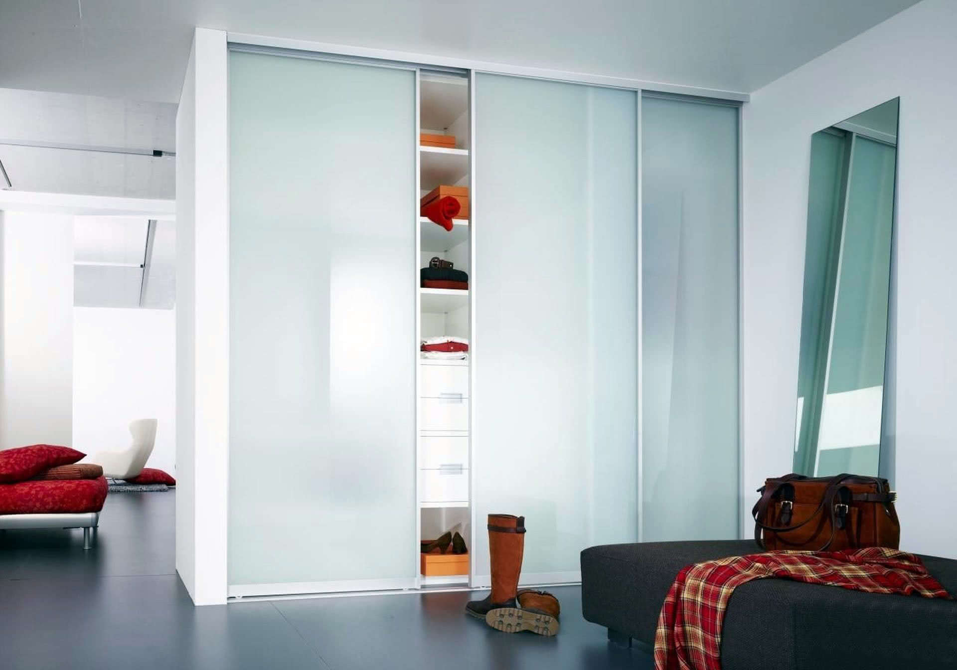 Встроенные модели с раздвижной дверью. Их можно расположить по стенам вдоль либо внутри специальных ниш, в самой стене. Установка своими руками может вызвать некоторые сложности в этом случае, но зато стоимость материалов доступнее для покупателей. Пол, потолок и стены помещения будут играть роль основания конструкции, что позволяет реализовать различные проекты.