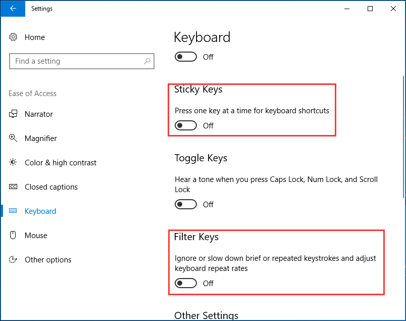 - Снимите флажок Filter Keys в разделе Упростите ввод