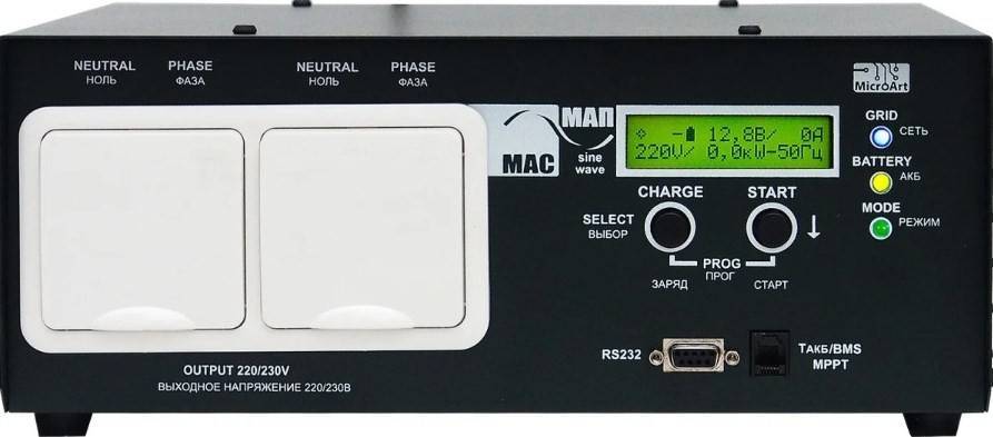 Считается бюджетным микроинвертором для солнечных батарей. Выдает сигнал в виде чистого синуса. Отлично подойдет для приборов малой мощности. Может автоматически выполнять переключение. Выходная мощность 200 ВА. Напряжение на выходе 220 v. Выполняет переход на АКБ за 4 мс. Его стоимость всего около 5000 р.