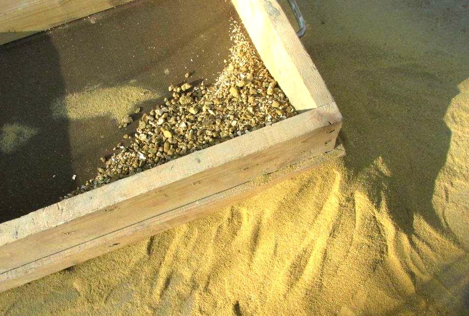 Любой песок, кроме мытого, необходимо просеивать. Ведь вручную удается избавиться только от сравнительно крупного мусора. От всего остального, что не всегда различимо глазу, помогает очистить массу металлическое сито с ячейками по полтора миллиметра. Во время просеивания песок должен сыпаться в заранее подготовленную емкость, стоящую внизу. Мусор потребуется иногда убирать, стряхивая его с внешней стороны сита.