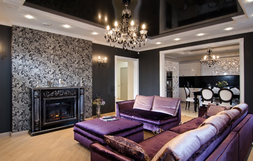 Потолок в таком интерьере делается светлым. Это может быть навесная конструкция, состоящая из нескольких слоев и декорированная точечным освещением. Что касается мебели, то в гостиной размещается диван (это может быть современная модель, выдержанная в минималистском стиле) буфет и комод. Если размеры гостиной позволяют, здесь можно расставить мебельные предметы по парам. Так как симметричная расстановка является основой пространственной композиции. В качестве основного центра в таком интерьере выступает камин (традиционный или электрический).