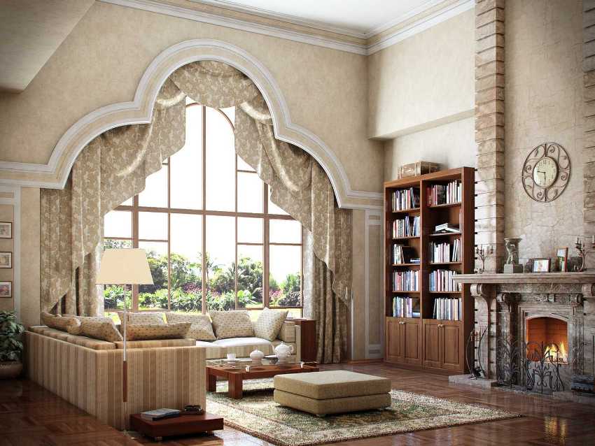 Работая над дизайном интерьера классической гостиной, нельзя не уделить внимания оконным и дверным проемам. Их также надо оформить помпезно, с показной роскошью. Начнем с декора дверей. Их проем следует видоизменить. Вместо стандартного прямоугольника должна появиться шикарная арочная конструкция желательно открытого типа. Если же без дверного полотна не обойтись, то отделывайте его натуральным шпоном, бронзовыми и латунными накладками, коваными ручками.
