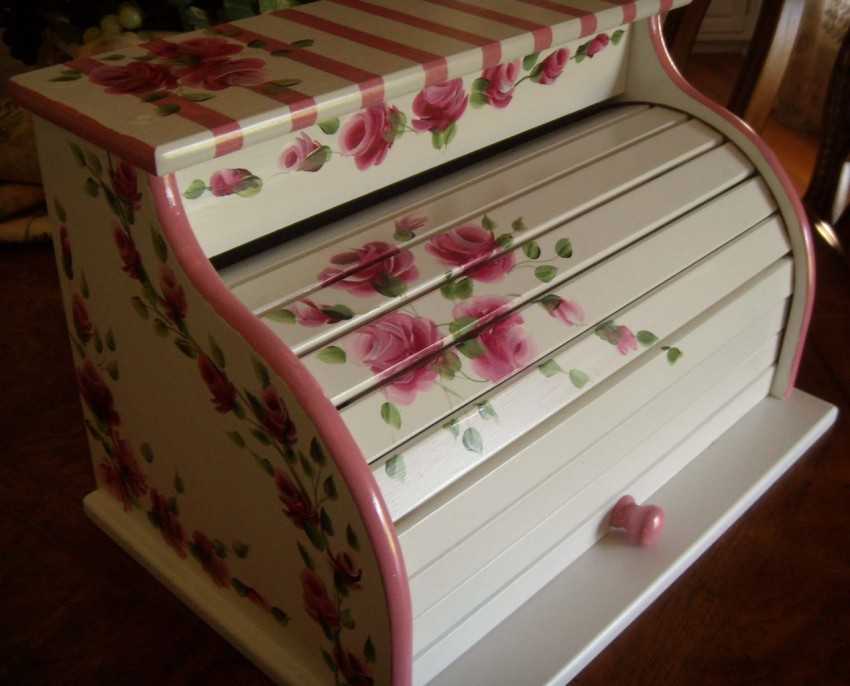Комбинация рукодельных приемов всегда смотрится выигрышно, если материалы, аксессуары подобраны гармонично. Украсить можно любую часть хлебницы, а в случае с навесной хлебницей стоит подумать о привлекательности не только лицевой стороны и боковин, но и днища.
