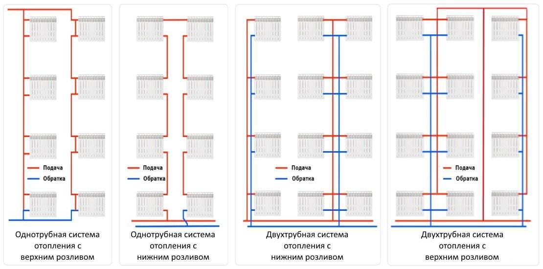Слева — усовершенствованный вариант однотрубной схемы (аналог «ленинградки»), справа — двухтрубный вариант. Последний обеспечивает более комфортные условия, точное регулирование и даёт более широкие возможности по замене радиатора
