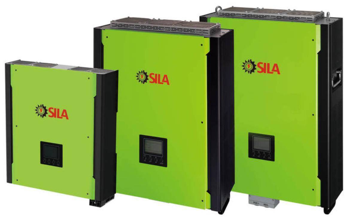 - SILA PV 4000P — солнечный гибридный инвертор, мощностью 4000 Вт, сочетающий в себе опции контроллера заряда АКБ, инвертора и ЗУ для аккумулятора на 220 В. Работает в диапазоне напряжений от 180 до 270 В. Номинальное U — 48 В. Температурный режим — от 0 до +55 градусов Цельсия. Размеры — 46,8х29,75х12,5 см.