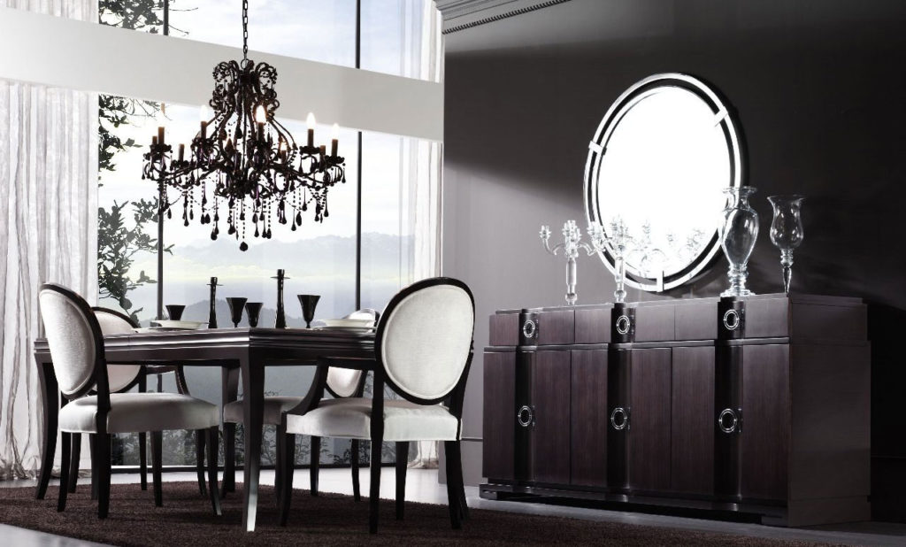 Стены кухни или столовой оформляются чаще мраморными плитами или имитирующими под натуральный камень поверхностями. Если кухня оснащена окном, то для него можно создать витраж. Это придаст уникальности и необычности интерьеру. Напольные покрытия облицовывают керамогранитной плиткой или паркетом темного цвета.