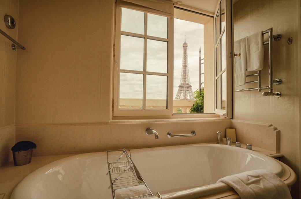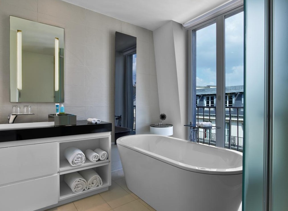 Обязательным элементом является ванна на ножках белого цвета, зеркало в позолоченной раме, миниатюрный шкафчик и плетеная корзина для белья.