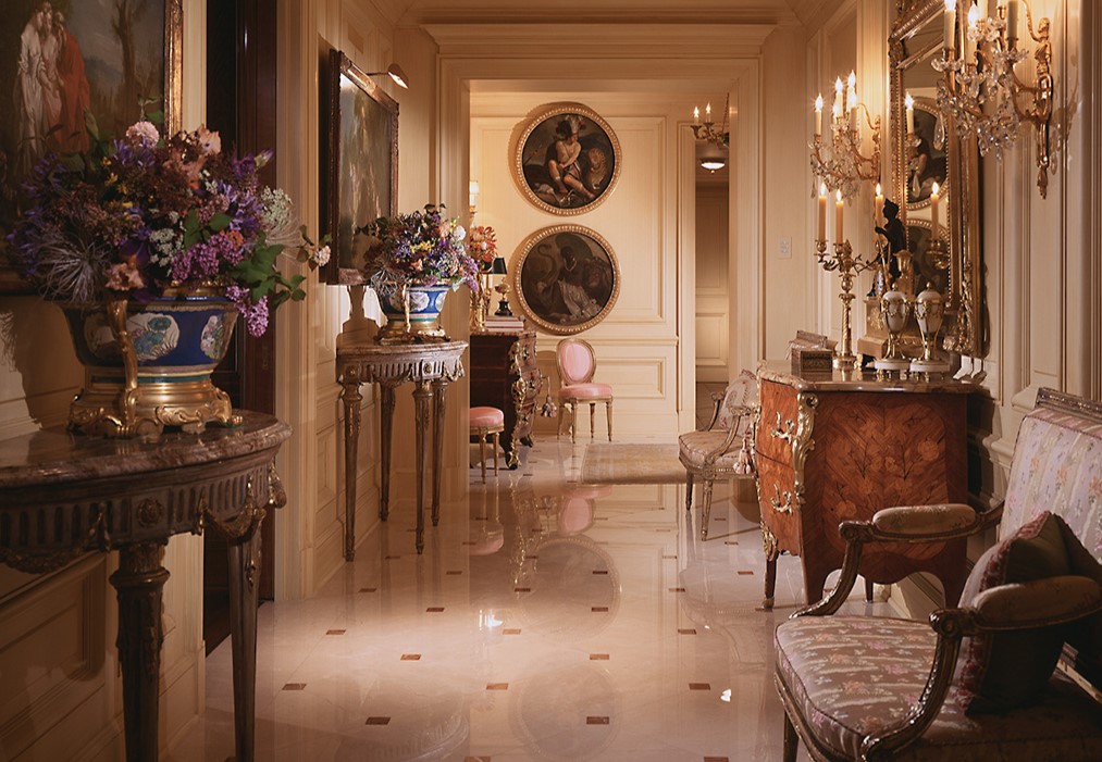 Приветствуются оттенки коричневого, бежевый, молочный цвет. Особое место отведено так называемым «металлическим цветам»: серебряному, золотому, латунному. Благодаря удачно подобранному освещению и обилию зеркал они начинают играть в полную силу.