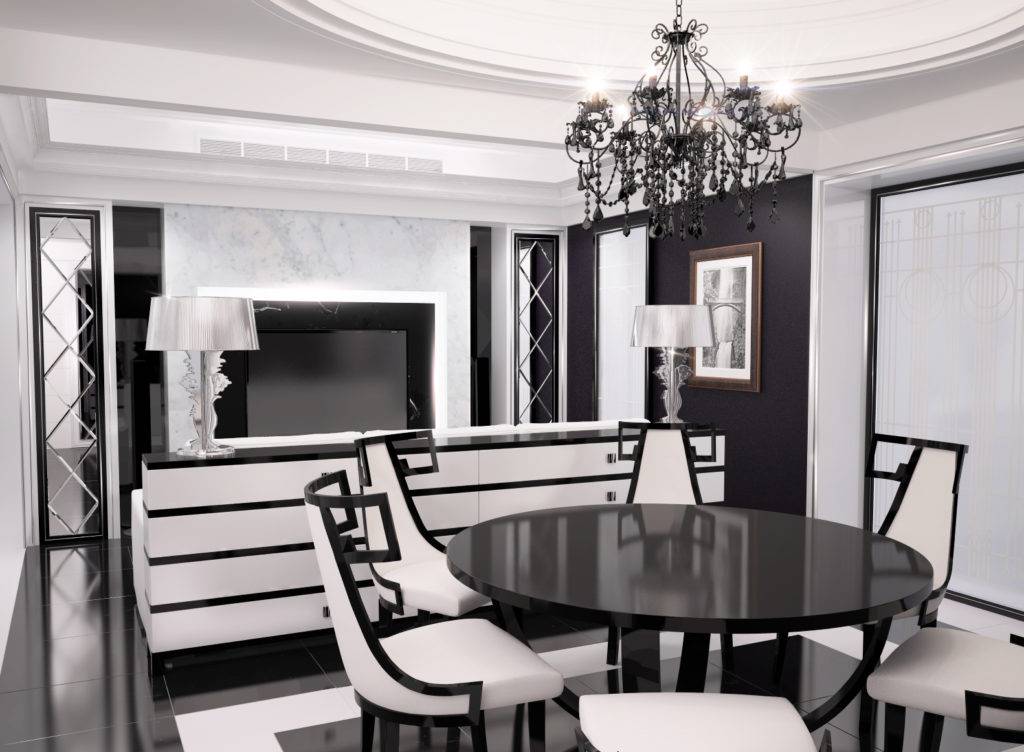К примеру, санузел может быть в черно-белой гамме, в соответствии с клавишами пианино. А в кухне ар-деко на полу могут лежать черно-белые плиты.