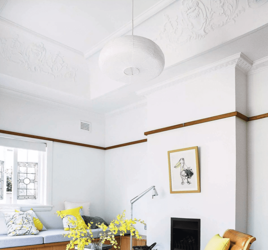 Потолочную зону, даже если на ней предусмотрены светильники, обязательно дополняют лепниной. При этом оттенок поверхности может быть бледно-розовым, молочным или светло-серым. Чтобы создать контраст стараются использовать темное покрытие пола (ламинат, кафель, деревянный паркет).