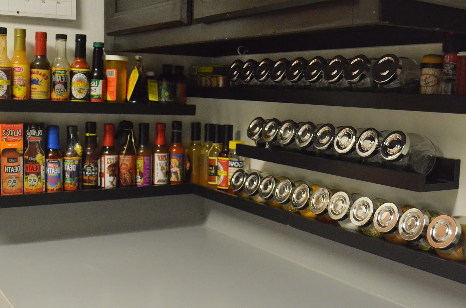 Некоторые люди крепят к стене специальную полку для хранения специй. Она хороша тем, что делает интерьер более уютным и приятным. К тому же, это удобно, потому как все банки можно сразу достать и использовать.
