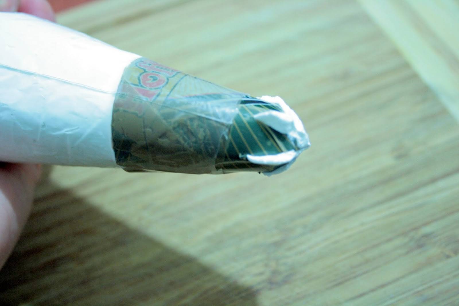 - Полученную насадку теперь соединяют с целлофановым кульком. Для этого угол мягкого пакета отрезают ножницами, не выше 2 см от края.