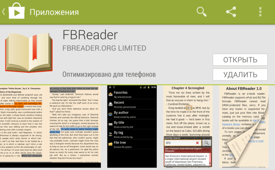 10 миллионов скачиваний. Рейтинг 4,5. Открывает форматы fb2, epub, txt, doc, rtf, html, chm, tcr, pdb, pml.