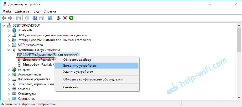 Так же можно открыть свойства, и посмотреть, нормально ли работает это устройство. В крайнем случае можно его отключить, перезагрузить компьютер и заново включить. Удалять не советую. Нет гарантии, что после перезагрузки он будет установлен автоматически. Можно вообще без звука остаться. Не только по HDMI.