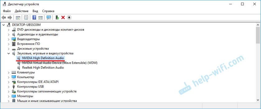 Так же проверьте вкладку “Звуковые, игровые и видеоустройства”. Там может быть адаптер “NVIDIA High Definition Audio”, или AMD. Это уже зависит от установленной видеокарты.