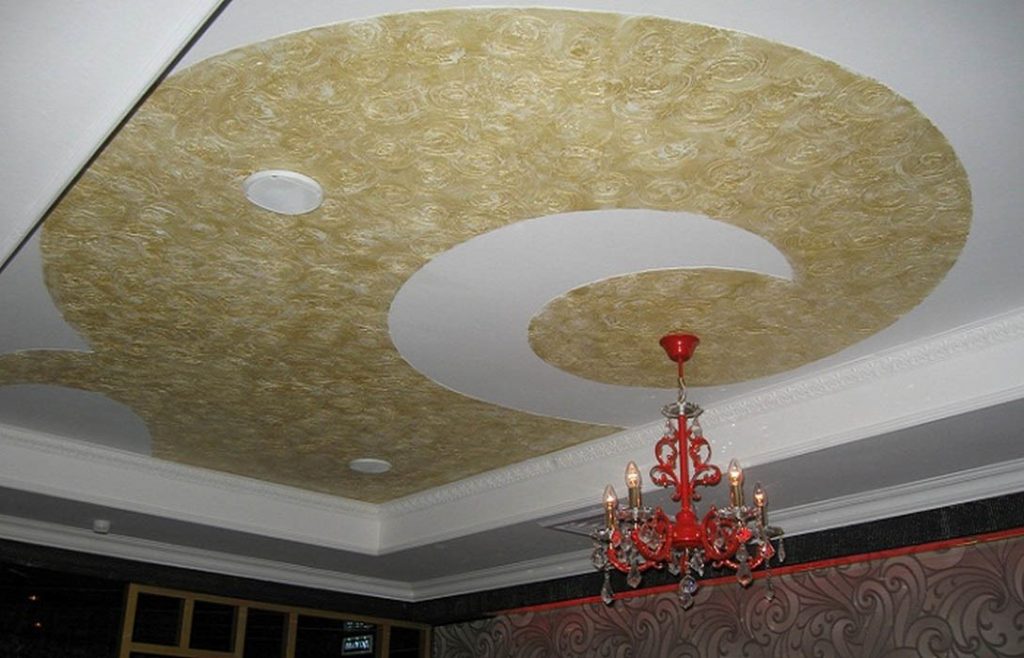 А теперь, давайте перейдём к практической части и посмотрим, как же можно использовать этот материал на потолке. Простор для фантазии тут просто неограничен. Мало того, что можно играть на разнице фактур, можно ещё и рисунки ими делать! Посмотрите на это фото, так это выглядит в интерьере.