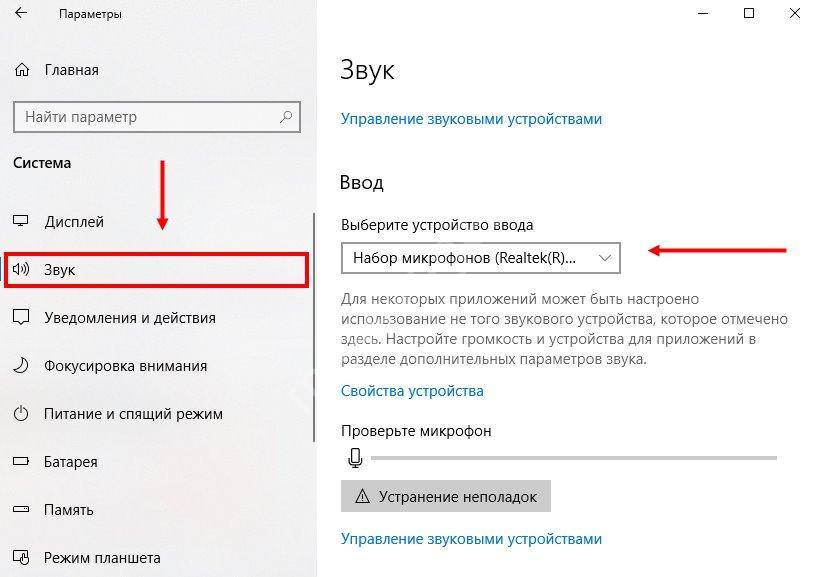 - Неверная настройка звука. Сначала необходимо зайти в параметры. Сделать это можно через меню «Пуск», «Мой компьютер» или нажав сочетание клавиш Win+I. В разделе «Система» (отображается самым первым в списке) нужно выбрать «Звук». Справа будет пункт «Ввод», который и отвечает за микрофон. Проверить, работает ли он, можно по специальному индикатору. Иногда Windows за устройство ввода принимает другое оборудование. В таком случае нужно самостоятельно выставить микрофон.
