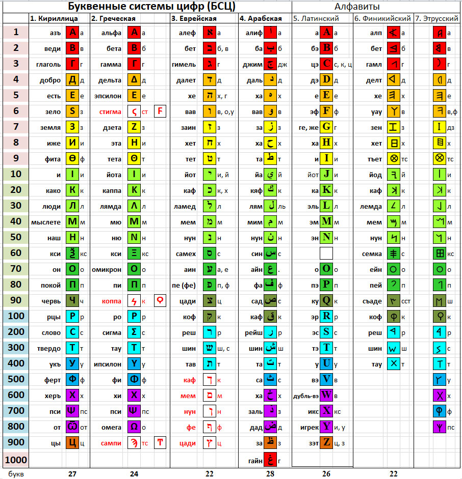 Цветом выделены куски мнемокода кириллической славянской буквенной системы цифр.Красным шрифтом вставные буквы.