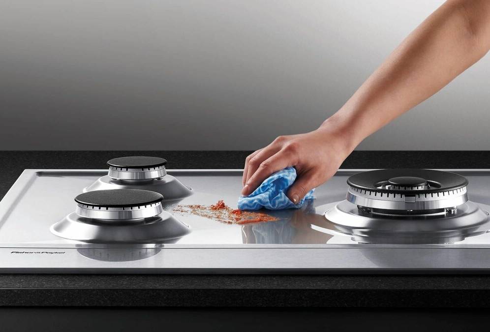 Хозяек волнует, как быстро и просто привести в порядок кухонную помощницу. Если потёки или брызги пищи не успели обгореть и надёжно закрепиться на варочной панели, то уборка эффективна при помощи мокрой тряпочки с моющим средством для посуды или без такового. Быстро отмыть газовый прибор с поверхностью из нержавеющей стали поможет сода. На влажную поверхность следует рассыпать примерно 2 столовые ложки гидрокарбоната натрия и равномерно распылить сверху воду. Такой очистке подлежат электроплиты, которые имеют сплошную поверхность.