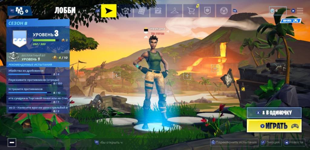 Запустите Fortnite — игра автоматически «подцепит» подключенный геймпад. Пошевелите стиком и на экране появятся подсказки в виде привязанных кнопок к пунктам меню.