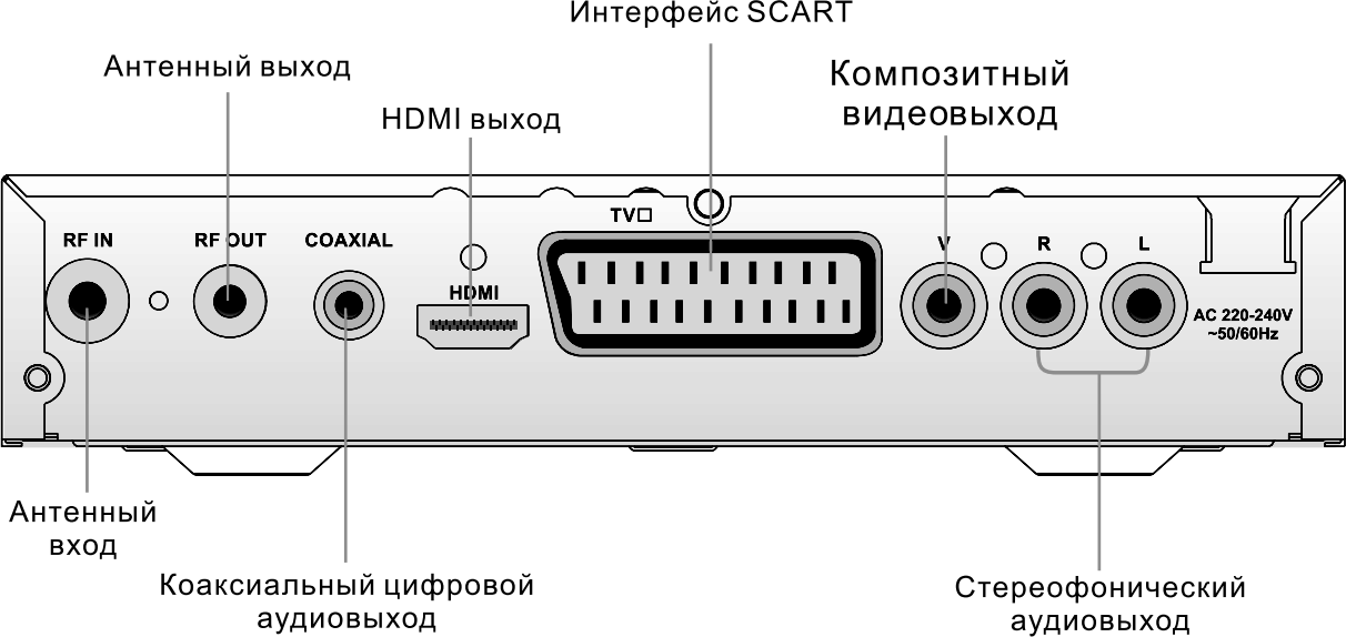 Все ресиверы вне зависимости от комплектации и количества опций имеют антенный вход и выход. Дополнительно предусмотрены: коаксиальный цифровой аудиовыход, разъемы HDMI, SCART, RCA (тюльпаны).