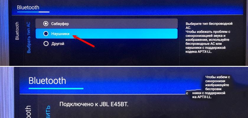 Запускаете этот режим, телевизор начинает искать новый прибор — и подключается к наушникам.