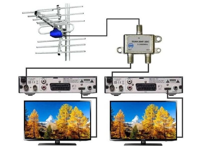 Альтернатива предыдущему варианту, когда используется одна антенна. Чтобы запараллелить кабель, используют сплиттер, который разветвляет один кабель на два. Каждый провод подключают к разным ресиверам, а от них передают сигнал на телеприемники.