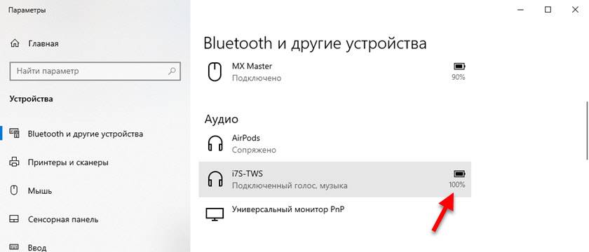 На компьютере уровень заряда батареи можно посмотреть в параметрах Bluetooth.