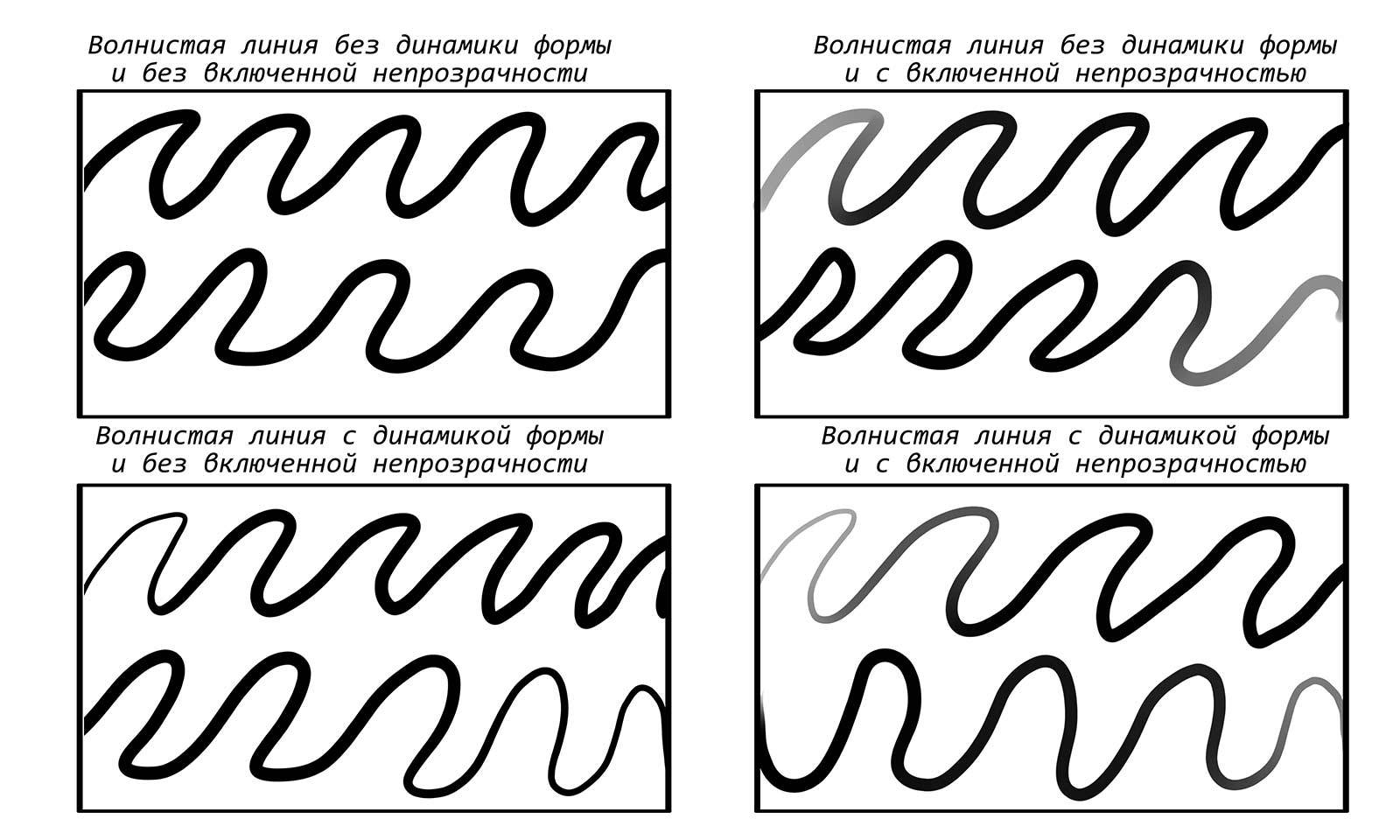 - Без динамики формы и без включенной непрозрачностью. Здесь вам нужна волнистая линия с ровными краями.