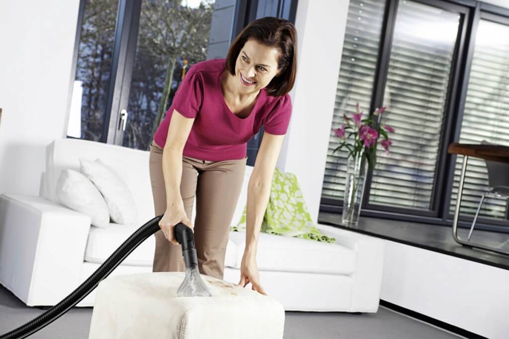 По аналогичной технике, что и мойка окон, очищают мебель — подготавливается устройство к работе, устанавливается щетка для мытья флоковой ткани. Действия осуществляются сверху вниз на сухом режиме, затем в контейнер заливается чистая жидкость без чистящих препаратов. Достаточно одного подхода, чтобы освежить обивку. Для устранения загрязнений в труднодоступных местах используют щелевую насадку с узким носиком.