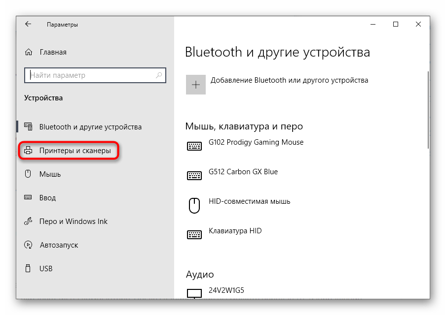 Через панель слева переместитесь к категории «Принтеры и сканеры».