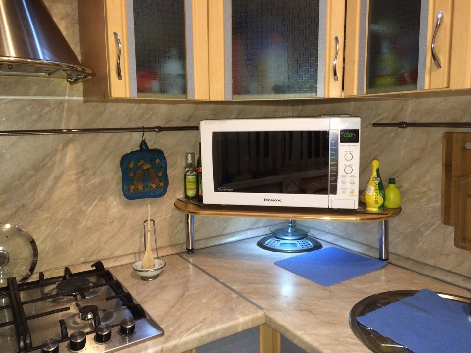 Часто микроволновую печь ставят в углу. В таком случае можно сделать или купить угловую полку. Особенно хорошо вписывается такой вариант под шкаф с угловой дверкой.