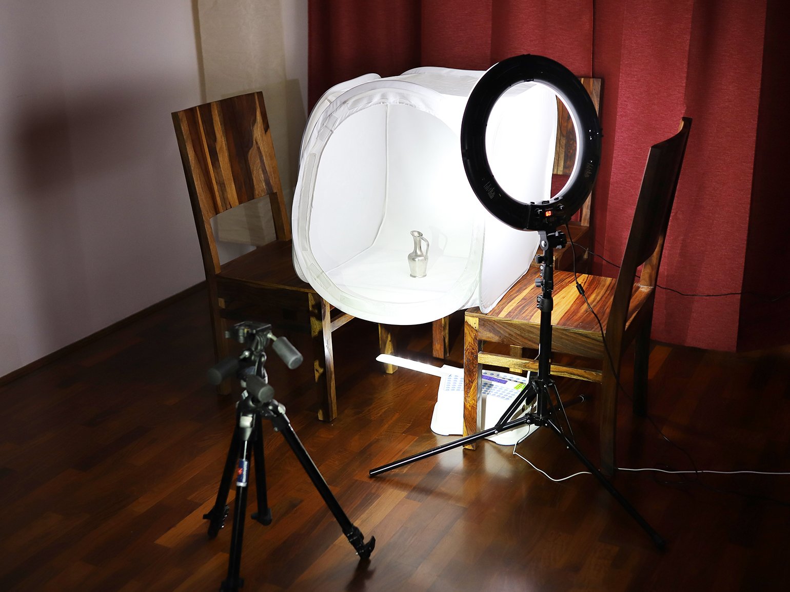 В центр фотобокса поместите объект съёмки. Отталкивайтесь от задач: например, если это коробка, можно немного её повернуть, чтобы кроме лицевой части были видны ширина и высота. Если же у объекта есть неудачные стороны, лучше выбрать такой ракурс, чтобы они не попадали в кадр.