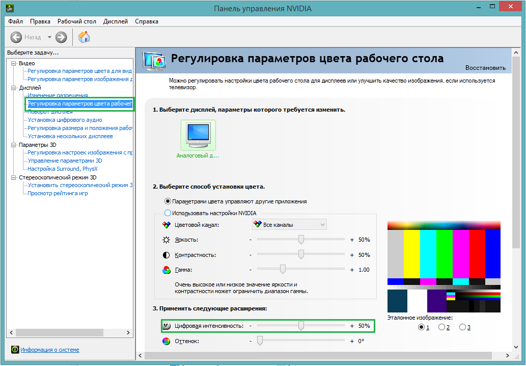 После чего станут доступны к изменению яркость, контрастность, гамма, цифровая интенсивность и оттенок. Очень высокое или низкое значение яркости и контрастности может ограничить доступный диапазон гаммы.