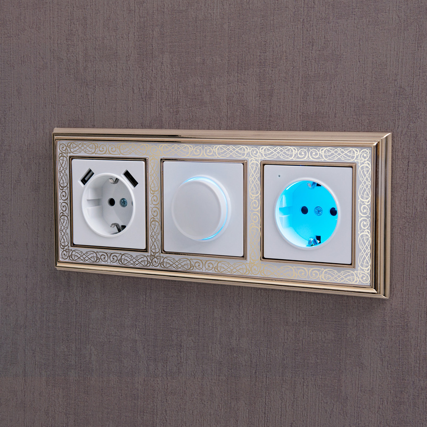 Этот способ основан на приобретении розеток с необычным дизайном. Можно подобрать вариант с золотым, деревянным, металлическим оформлением в соответствии с особенностями интерьера.