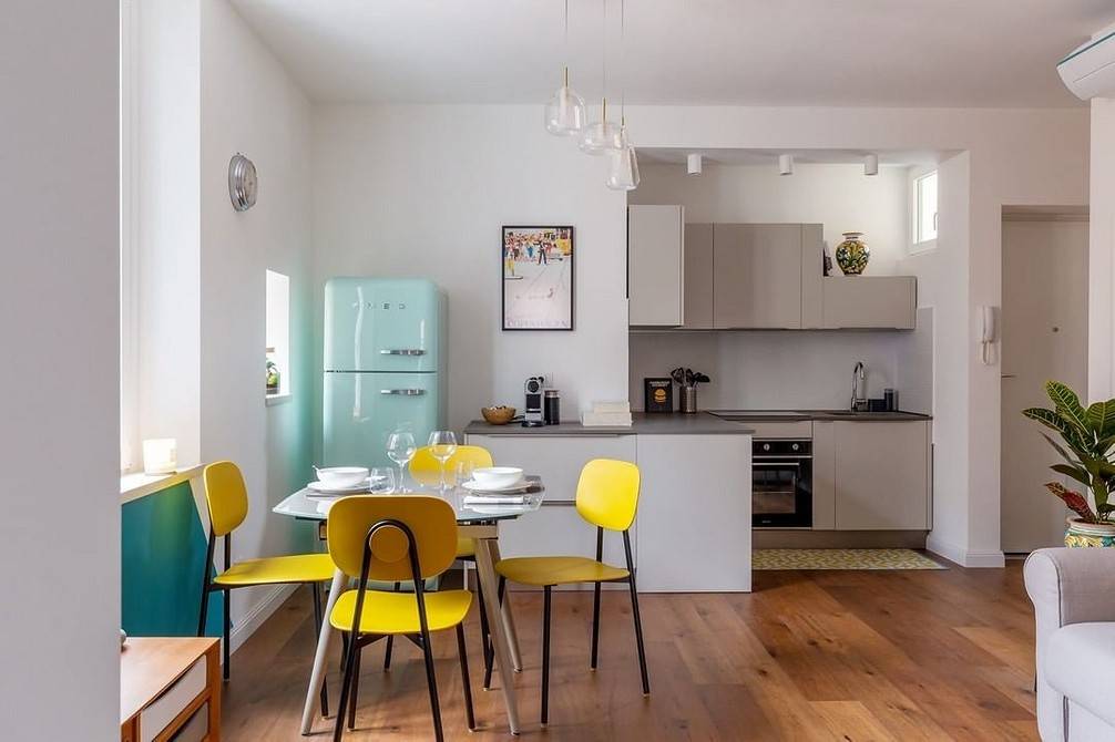 Самый удобный из представленных. Такой приём иногда используют даже дизайнеры в объединенных пространствах столовой и кухни. Он подойдет всем, кто не решил, куда поставить холодильник в студии.Что стоит учитывать в таком расположении? Первое — стиль оформления комнаты или квартиры. В отличие от встроенной техники, где важна маскировка, это приём работает «от обратного». Устройство скорее всего будет визуальным акцентом. Судите сами: одно дело, когда рядом с обеденным столом стоит ретрохолодильник насыщенного цвета, и другое — классический хромированный агрегат. Второй явно будет выделяться не лучшим образом: создастся ощущение, будто его сюда просто поставили на время ремонта.