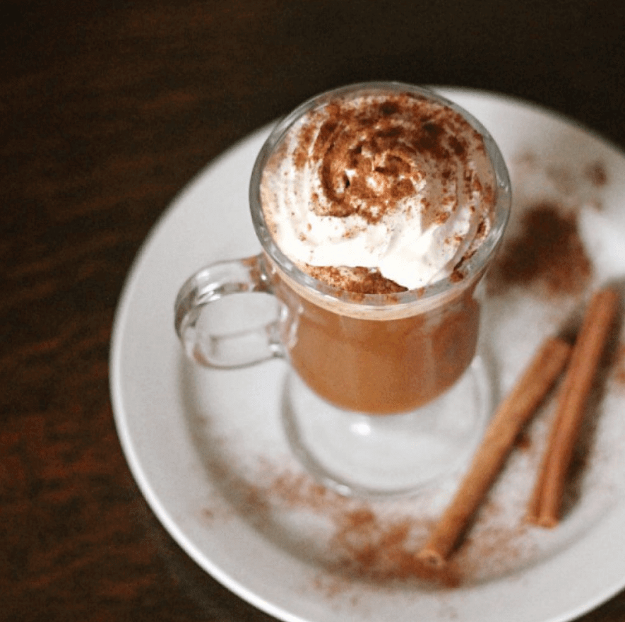 Элегантно выглядит бокал либо специальная кружка с таким напитком, дополненная палочкой корицы. Она же, только в виде порошка, может быть насыпана на поверхность пены.